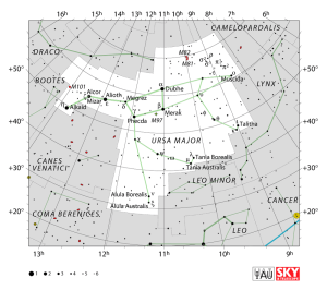 Mapa da constelação da Ursa Maior. Nesta secção, todas as 88 constelações terão um mapa semelhante, que inclui a delimitação, forma, estrelas e objectos de céu profundo relevantes de cada uma. Além do mapa, haverá uma foto astronómica da constelação e também uma ilustração da figura que a respectiva constelação tem associada.