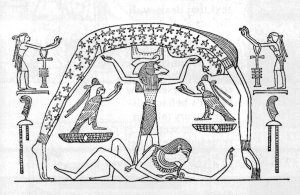 Figura 3 - A deusa egípcia Nut (o firmamento) suportada pelo deus Shu e separada do seu amante (a Terra). |