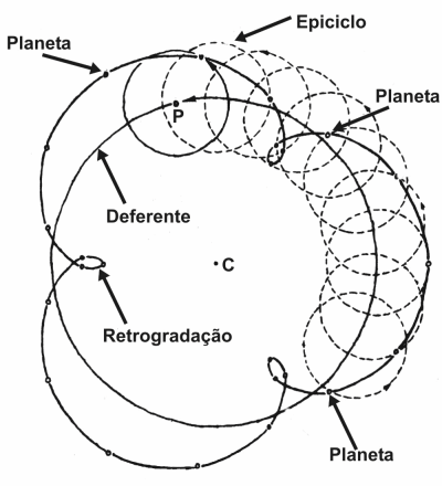 Assumia-se que o ponto P se movia uniformemente no círculo de referência ou deferente. No entanto, as velocidades obtidas ainda não reflectiam bem as velocidades dos planetas e muito menos as retrogradações. O ponto P era apenas um ponto imaginário no deferente em torno do qual se definia o epiciclo. O epiciclo era uma circunferência centrada no ponto P e sobre a qual o planeta descrevia a sua trajectória num movimento circular uniforme. Para tornar o movimento do planeta idêntico à observação era apenas necessário adaptar os tamanhos do deferente e dos epiciclos até se obter a curva ajustada às observações. |