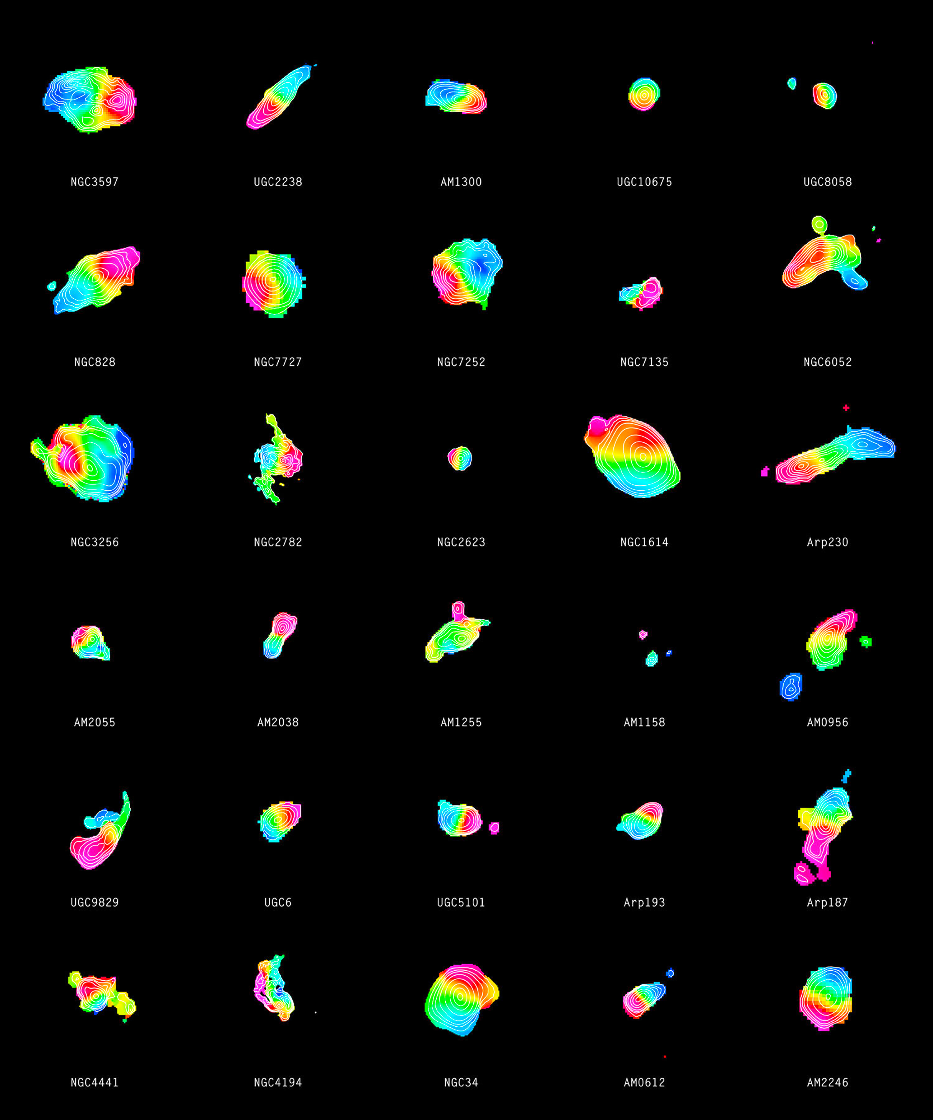 Cada um dos objectos coloridos na imagem ilustra uma das 30 galáxias em fusão. Os contornos das galáxias individuais indicam a dispersão do monóxido de carbono, enquanto que a cor representa o movimento do gás. Gás que se afasta de nós aparece a vermelho e gás que se aproxima está a azul. Os contornos juntamente com a transição de vermelho para azul indicam um disco gasoso que roda em torno do centro da galáxia.