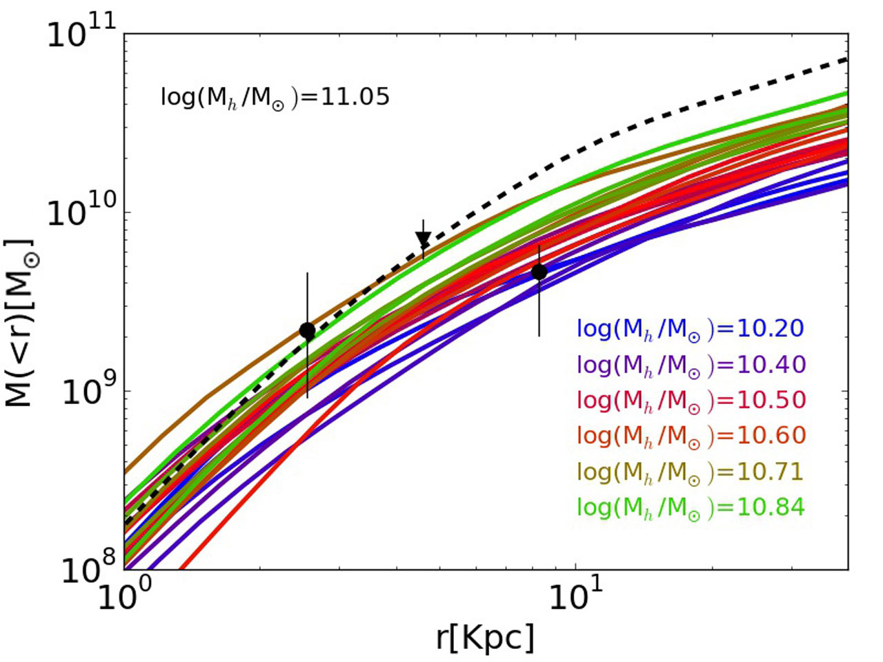 Os perfis de massa de galáxias ultradifusas simuladas (linhas coloridas) e de galáxias observadas (símbolos escuros), indicando que as galáxias ultradifusas são galáxias anãs, muito mais pequenas que a Via Láctea.