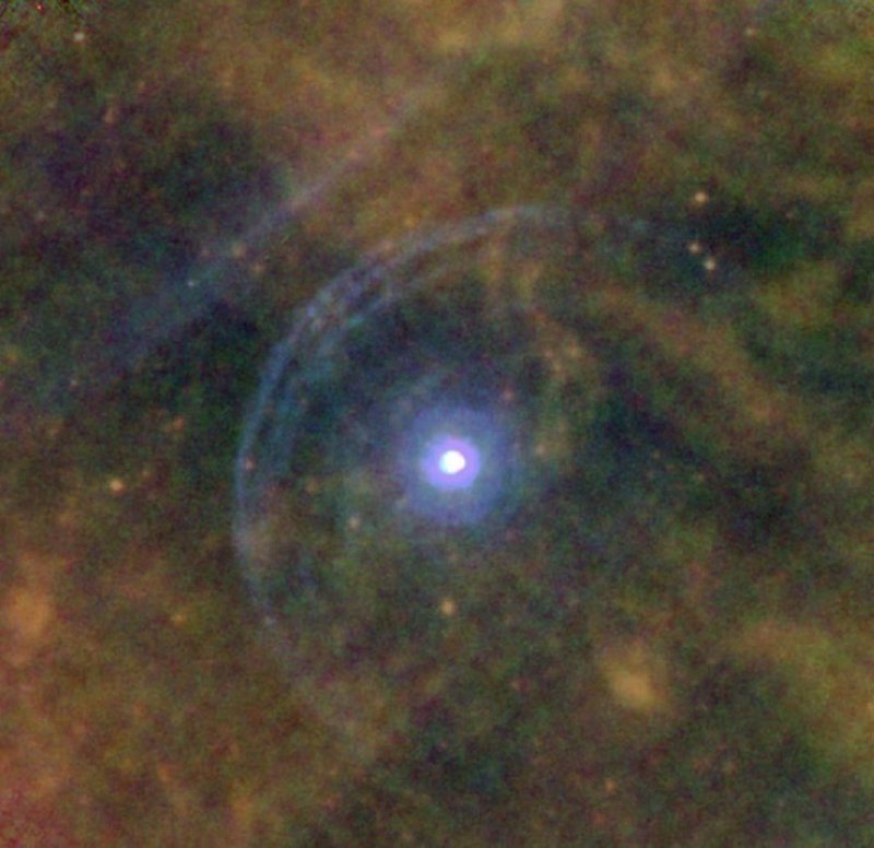Esta imagem infravermelha de Betelgeuse, obtida pelo Herschel em 2012, mostra duas conchas de matéria em interação num lado da estrela.