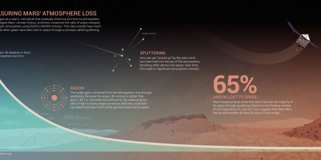 "Nós determinámos que a maioria do gás presente na atmosfera de Marte foi perdido para o espaço," realça Bruce Jakosky, investigador principal da MAVEN (Mars Atmosphere and Volatile Evolution Mission), da Universidade do Colorado em Boulder, EUA. A equipa fez esta determinação a partir dos últimos resultados, que revelam que aproximadamente 65% do árgon que já esteve presente na atmosfera foi perdido para o espaço. Jakosky é o autor principal de um artigo sobre esta investigação, publicado no passado dia 31 de março na revista Science.