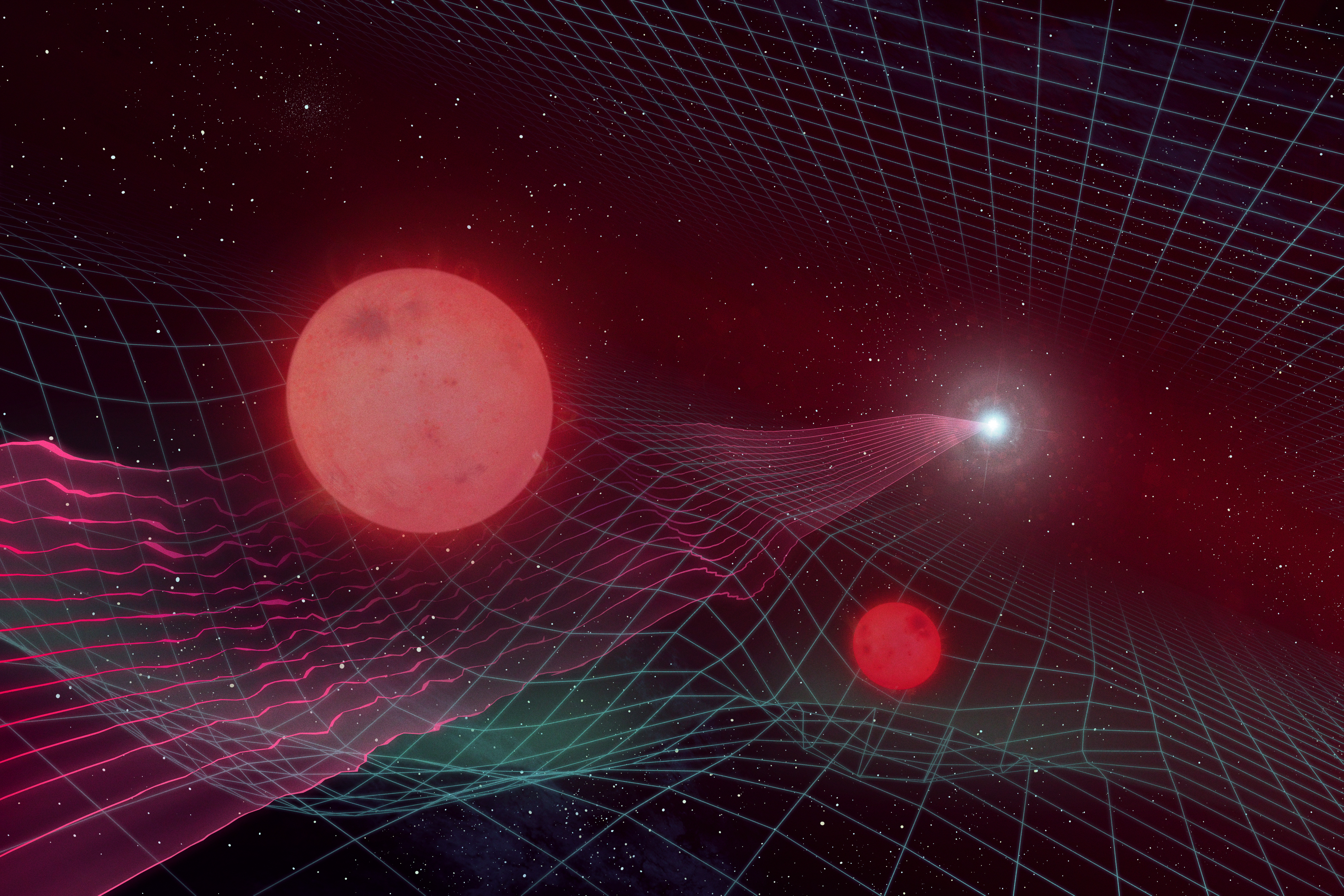 Impressão de artista do sistema binário descoberto no evento de microlente Gaia16aye, a sua gravidade distorcendo o tecido do espaço-tempo e o percurso da luz de uma estrela ainda mais distante.
