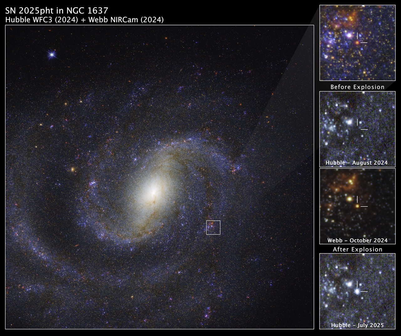 Utilizando o ASAS-SN (All-Sky Automated Survey of Supernovae), os astrónomos detetaram pela primeira vez a supernova, designada SN 2025pht, no dia 29 de junho de 2025. A sua luz tinha viajado a partir de uma galáxia próxima chamada NGC 1637, localizada a 40 milhões de anos-luz da Terra.