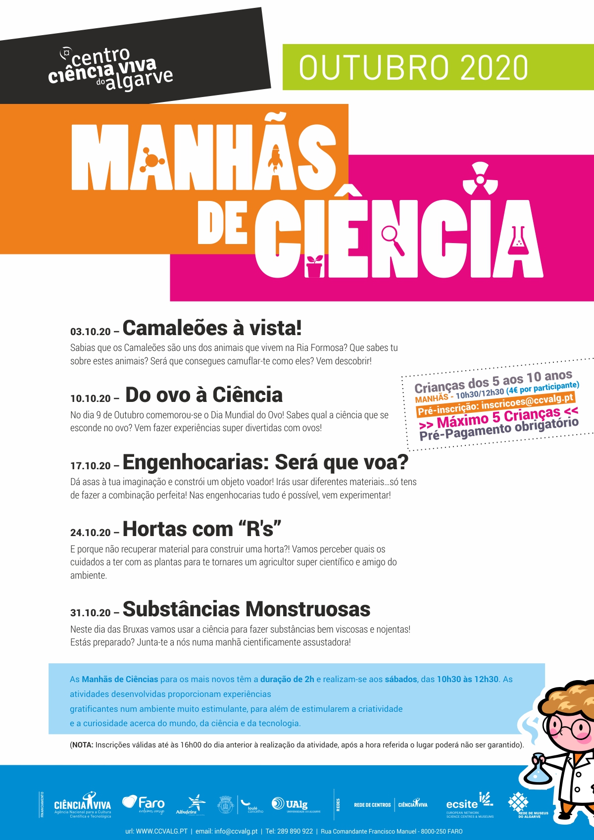 Atividades lúdico-científicas, dos 5 aos 10 anos As manhãs de ciências para os mais novos têm a duração de 2h e realizam-se aos sábados, das 10h30 às 12h30. As atividades desenvolvidas proporcionam experiências gratificantes num ambiente muito estimulante, para além de estimularem a criatividade e a curiosidade acerca do mundo, da ciência e da tecnologia.