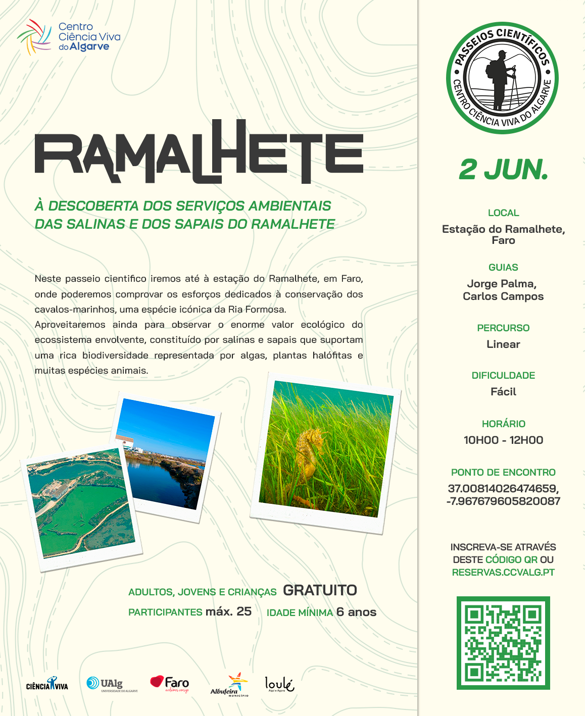 Neste passeio cientifico iremos até à estação do Ramalhete, em Faro, onde poderemos comprovar os esforços dedicados à conservação dos cavalos-marinhos, uma espécie icónica da Ria Formosa.