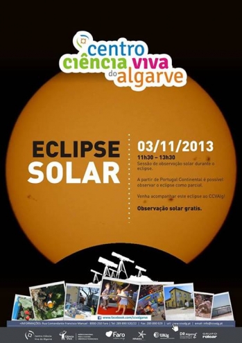 No próximo Domingo ocorrerá um eclipse solar, observado a partir de Portugal como um eclipse parcial do Sol pela Lua. As ilhas da Madeira estarão em posição mais favorável para observar um eclipse mais notório. Em Portugal Continental, o Centro Ciência Viva do Algarve irá realizar uma sessão de observação solar durante este eclipse, entre as 11:30 e as 13:30 de 3 de Novemebro. Se a meteorologia for favorável, espera-se observar cerca de 10% do diâmetro aparente do Sol tapado pela Lua, o que corresponde a cerca de 8% da área total do disco solar tapado.