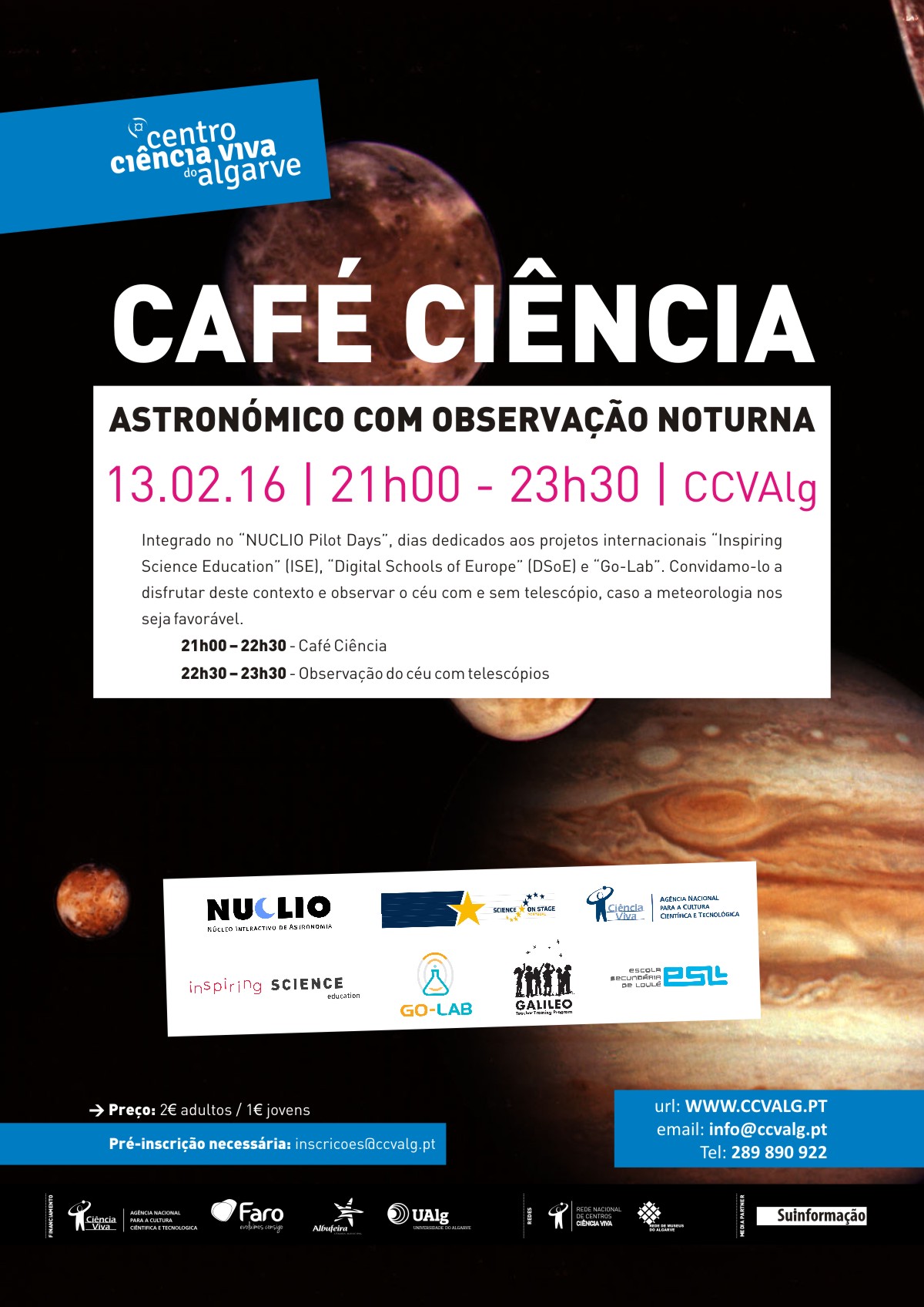 Integrado no “NUCLIO Pilot Days”, dias dedicados aos projetos internacionais “Inspiring Science Education” (ISE), “Digital Schools of Europe” (DSoE) e “Go-Lab”. Convidamo-lo a disfrutar deste contexto e observar o céu com e sem telescópio, caso a meteorologia nos seja favorável.