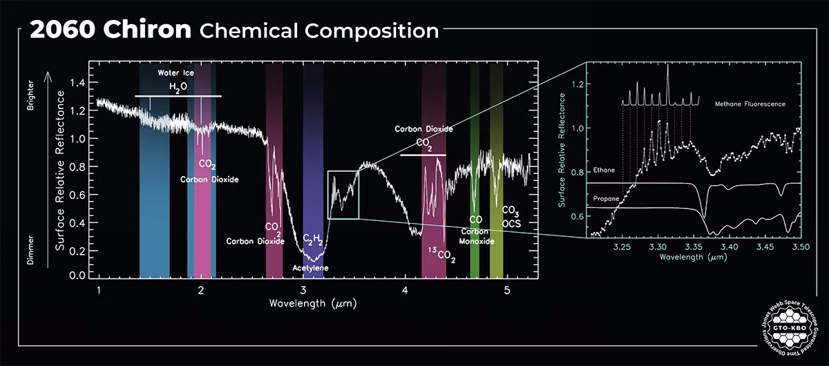 A composição química de Quíron. As bandas coloridas destacam os diferentes gelos, tais como a água, óxidos de carbono e hidrocarbonetos leves. Inserção - pormenor da refletância de Quíron destacando a fluorescência do gás metano juntamente com as absorções dos gelos de etano e propano.