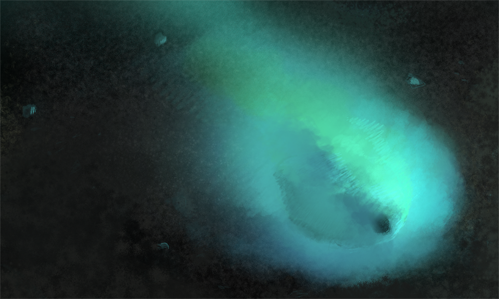 Uma representação artística do núcleo de Quíron rodeado por detritos e uma cabeleira de poeira e gás.