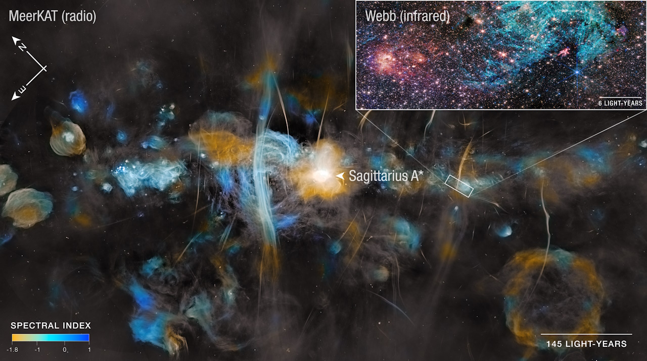A imagem de 2023 de Sagitário C, feita pelo Webb, mostrou dezenas de filamentos distintos numa região de plasma quente de hidrogénio que rodeia a principal nuvem de formação estelar. Uma nova análise feita por Bally e pela sua equipa levou-os a colocar a hipótese de os filamentos serem moldados por campos magnéticos, que também foram observados no passado pelos observatórios terrestres ALMA e MeerKAT.