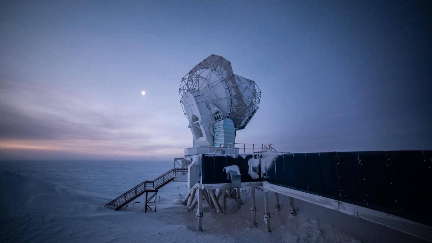 O céu extraordinariamente limpo e a atmosfera estável da Antártida permitem ao SPT captar a muito ténue radiação cósmica de fundo em micro-ondas.
