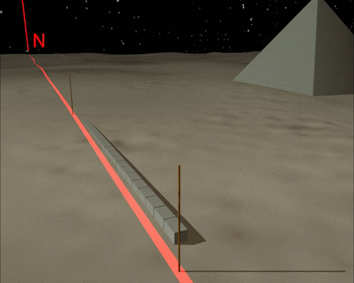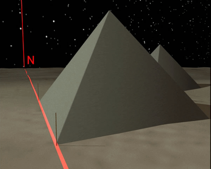 Para a construção das pirâmides era importante achar o alinhamento a Norte, pois uma das faces deveria ficar perfeitamente virada a Norte. Os Faraós, com a ajuda de uma sacerdotisa e de escravos, alinhavam estacas na direcção Norte, buscando-a com as guardas da Ursa Maior (que nesse tempo eram “Phecda” e “Megrez” e não “Dubhe” e “Merak”) (Figura 4). O alinhamento obtido era então usado para construir as partes laterais da pirâmide, perpendicularmente às quais deveriam ficar os topos sul e norte (Figura 5).