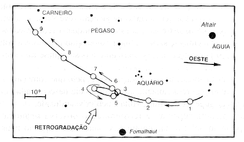 Uma vez que os astros “errantes” parecem errar entre os “fixos” de noite para noite ao longo do ano, foi-lhes dado o nome de planetas (derivado do verbo grego equivalente a “errar”). Os sete “planetas” – o Sol, a Lua, Mercúrio, Vénus, Marte, Júpiter e Saturno – moviam-se individualmente entre as estrelas fixas, com velocidades diferentes e com um movimento que aparentemente parecia aleatório (como se verificava nas retrogradações), daí que se dissesse que erravam (Figura 13).