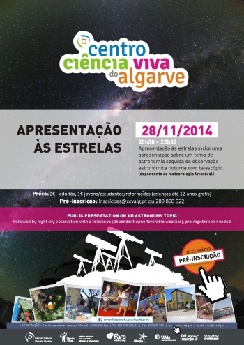 Apresentação às estrelas inclui uma apresentação sobre um tema de astronomia seguida de observação astronómica noturna com telescópio (dependente de meteorologia favorável).