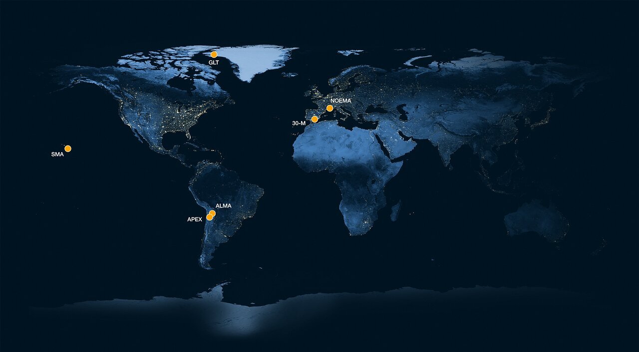 Neste mapa, os pontos amarelos marcam a localização das antenas e redes que participaram numa experiência piloto levada a cabo pela Colaboração EHT (Event Horizon Telescope). Nesta experiência foi utilizada pela primeira vez com sucesso a técnica de interferometria de linha de base muito longa, que liga telescópios separados por centenas ou milhares de quilómetros, para observar a radiação a um comprimento de onda de 0,87 mm. Ao observar a radiação a este comprimento de onda mais curto, os investigadores do EHT conseguiram obter observações com maior resolução do que anteriormente, sem a necessidade de criar um telescópio maior. As deteções efetuadas apresentam a maior resolução jamais obtida a partir da superfície da Terra.